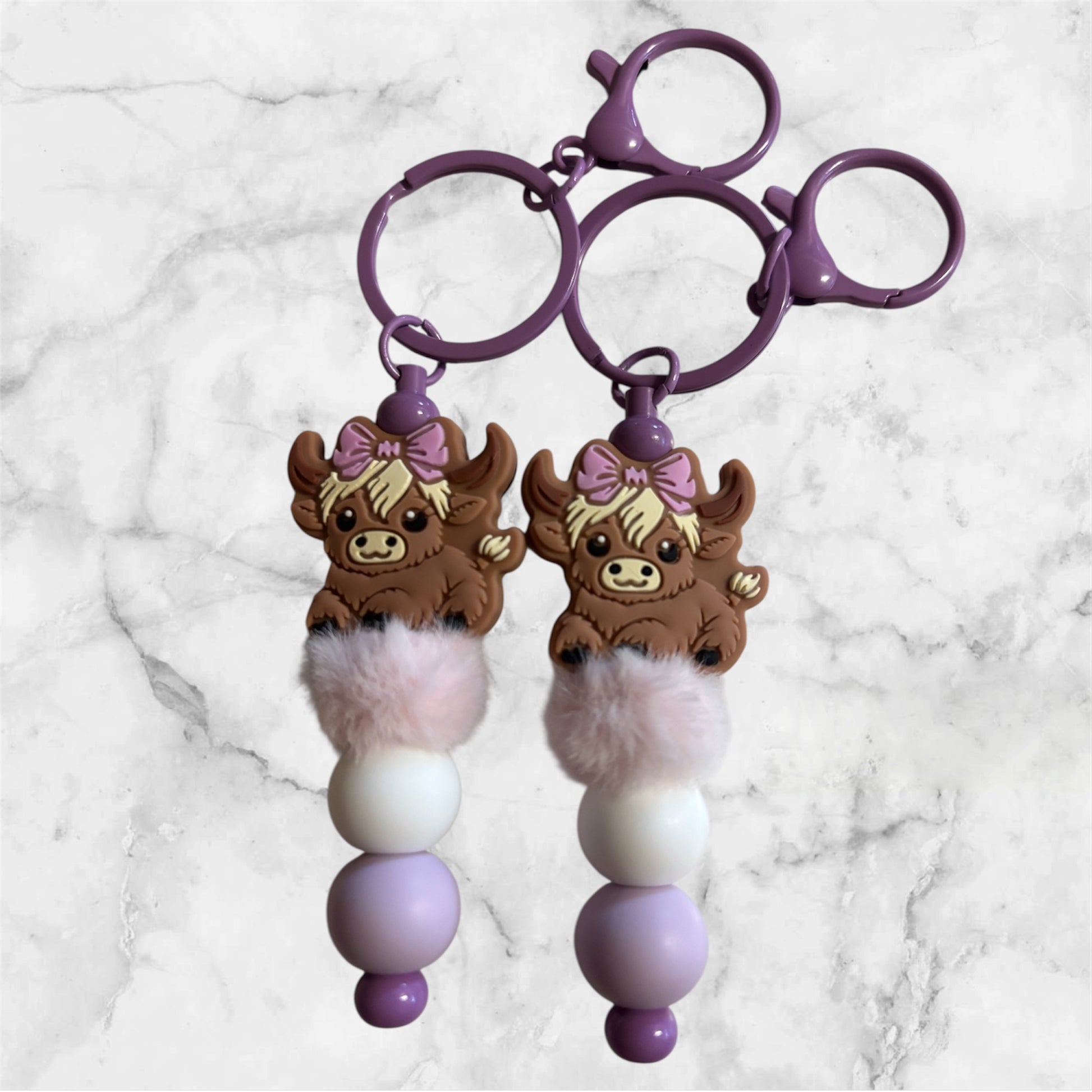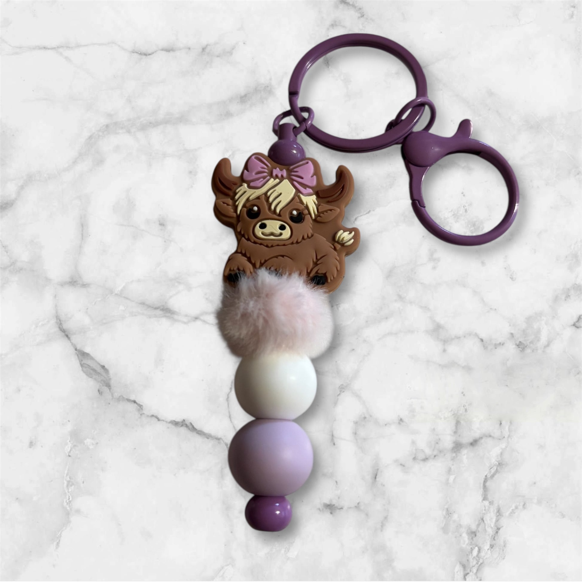 💜🐮 Sweet, soft, and cute! This Highland cow keyring features a darling cow with a lilac bow, fluffy pom pom, and pastel silicone beads in blush and lilac tones. The perfect mix of adorable and practical - a must have accessory for your keys, bag, or as a thoughtful little gift!🐮💜