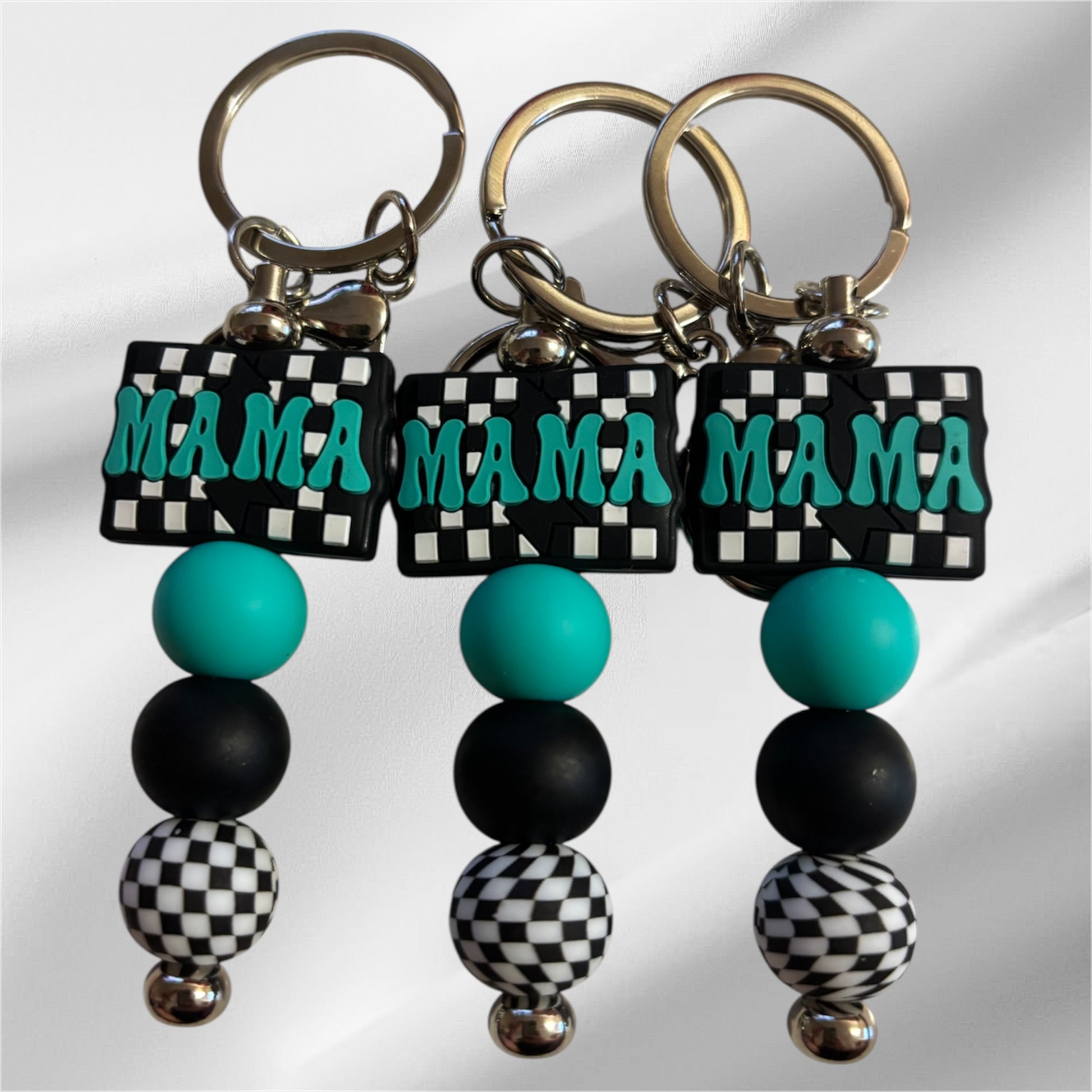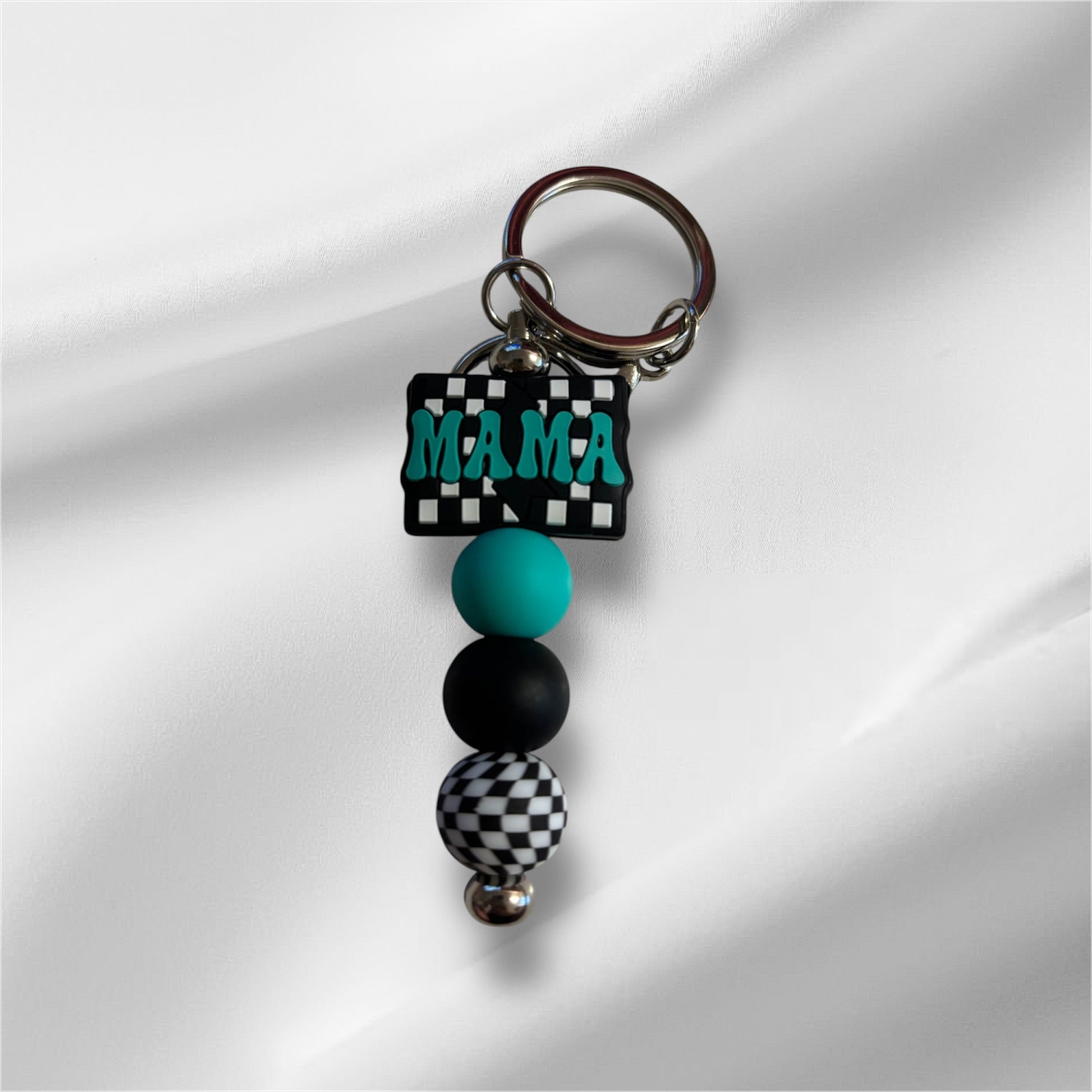 π€π Show off your mama pride in style! This silicone beaded keyring features a bold βMAMAβ charm with a trendy checkered design, paired with matching beads in black, teal, and monochrome patterns. Lightweight, durable, and super fun!Β The perfect accessory for keys, bags or a thoughtful gift for any mama.ππ€